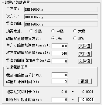 弹塑性动力时程分析采用地震波加载,一般超限审查中采用双向或三向地震波加载,主方向地震波峰值一般根据《高规》表4.3.5设定,主方向为水平方向的工况三个方向地震动比值一般为1:0.85:0.65(一般以X或Y向为主方向,特殊情况下还需增加斜交方向工况)。对于特殊结构还需进行竖向地震为主工况分析,三向比例一般为0.4:0.4:1。